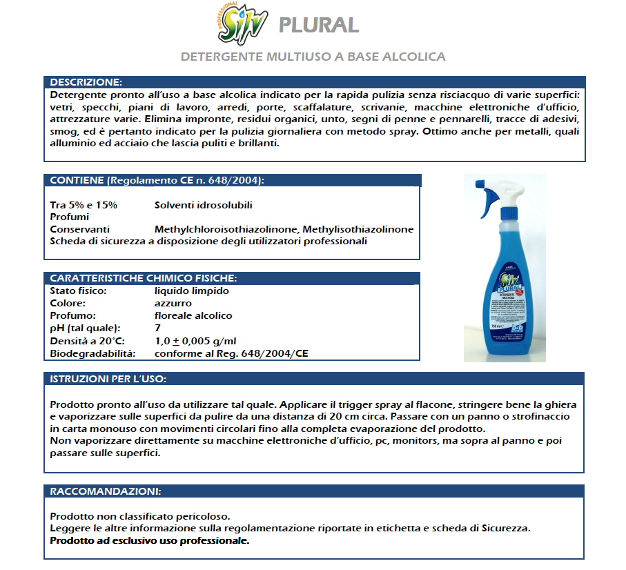 Detergente pronto all’uso a base alcolica indicato per la rapida pulizia senza risciacquo di varie superfici: vetri, specchi, piani di lavoro, arredi, porte, scaffalature, macchine elettroniche d’ufficio e attrezzature varie. Ottimo anche per metalli, quali alluminio ed acciaio che lascia puliti e brillanti.
